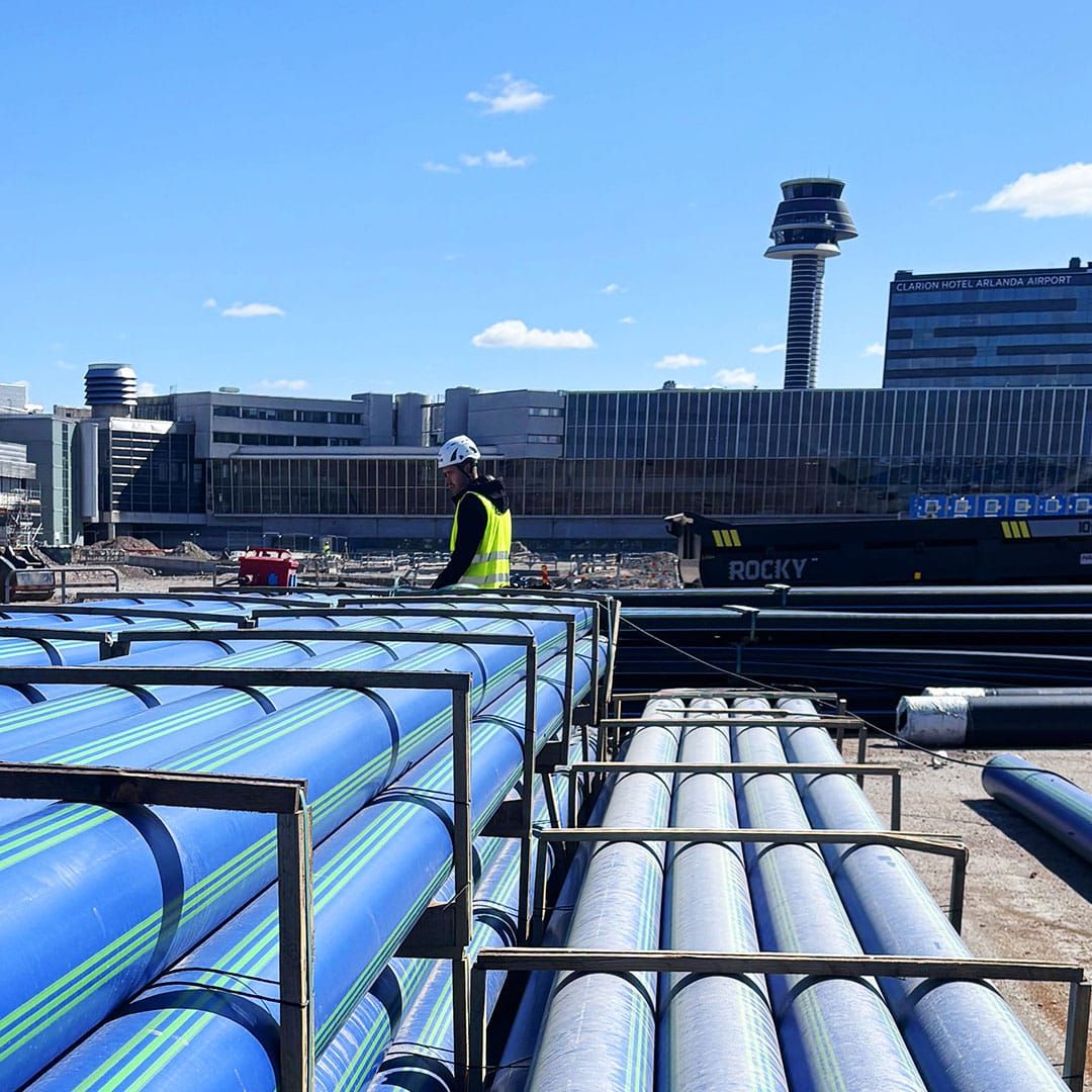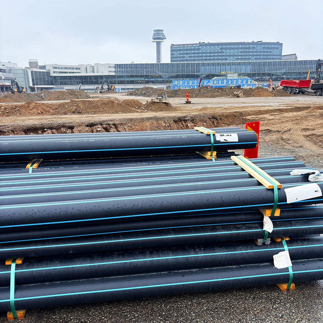 Arbetet omfattar cirka 1 160 meter diffusionstäta PE100-tryckrör (SDR11 PN16) som förläggs på Airside, där kraven på säkerhet och miljöskydd är exceptionellt höga.